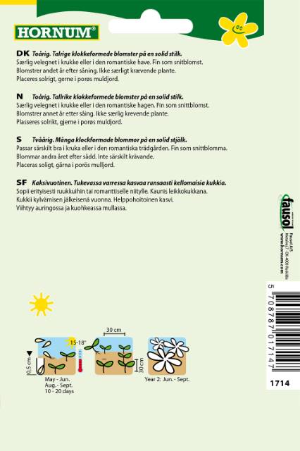 Særlig velegnet i krukke eller i den romantiske have. Fin som snitblomst. Blomstrer andet år efter såning. Ikke særligt krævende plante.