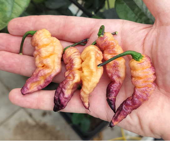 Plante: 80-100 cm med forholdsvis stort udbytte af ca 7cm lilla/beige chilifrugter.