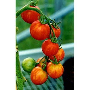 Almindelig tomat. En meget rigtbærende sort med normalstore tomater, orangerøde med grønlige striber. Når striperne rødmer/bliver orange, er tomaten moden.