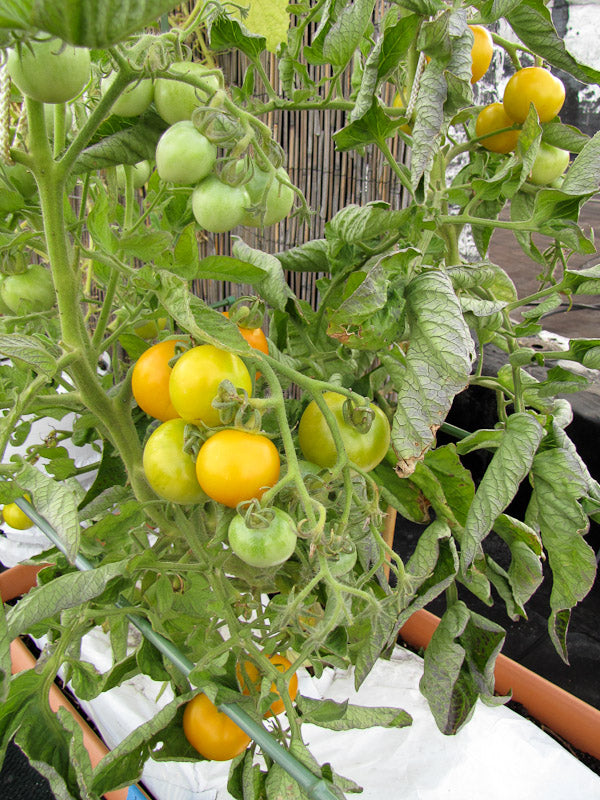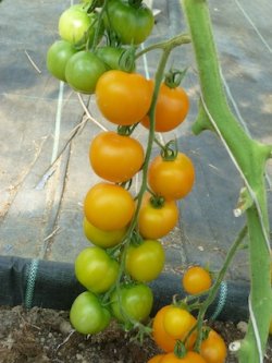 Almindelig tomat. En gammel engelsk tomatsort. Højtvoksende med store klaser af velsmagende gule tomater. 80g