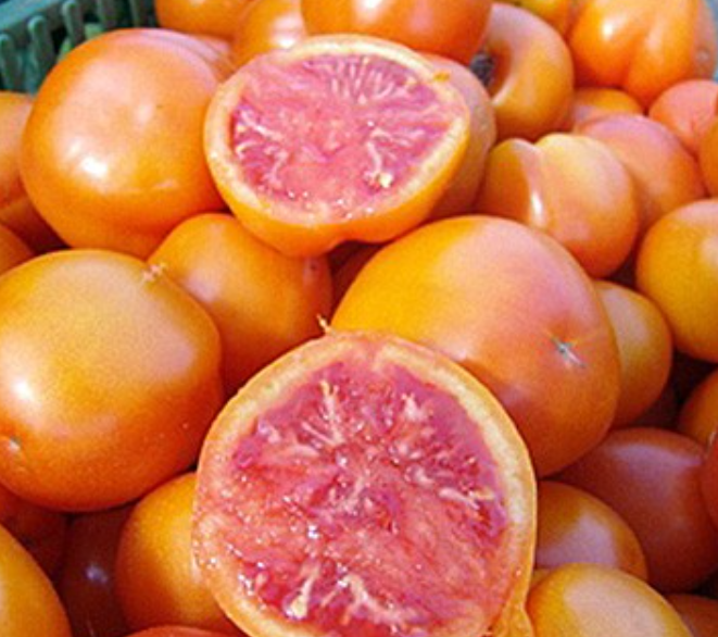 Sjælden tomat - almindelig af størrelse. Højtydende plante med masser af orange tomater. er rød indvendig som moden. Meget fyldig tomatsmag. 80-100g pr frugt. Indeterminant.